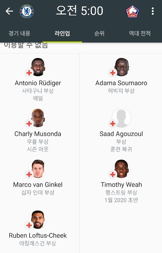 부상자를 보면 첼시는 4명, 릴은 3명이 있습니다. 양팀모두 부상자가 있지만 대체하지 못하는선수는 없는 것 같네요