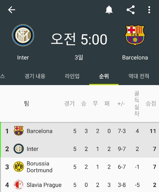 하지만 인터밀란의 경우는 승점 7점으로 도르트문트와 승점이 같고 골득실로 2위에 랭크되어 있는 상황이죠