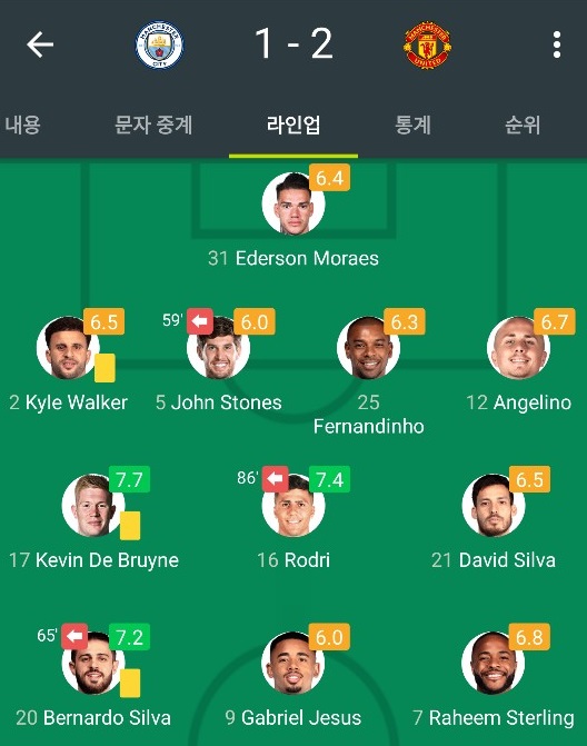 맨시티의 라인업입니다. 확실히 아구에로가 부상으로 못 나오니 결정력이 없어졌고, 제주스는 이번 시즌 폼이 좋지 못하네요!
