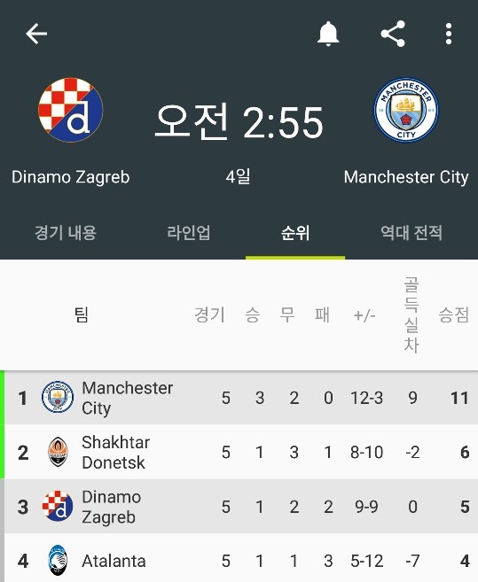 조별순위를 보면 맨시티는 승점 11점으로 이번 경기 져도 1위로 16강 진출이 확정되었습니다.