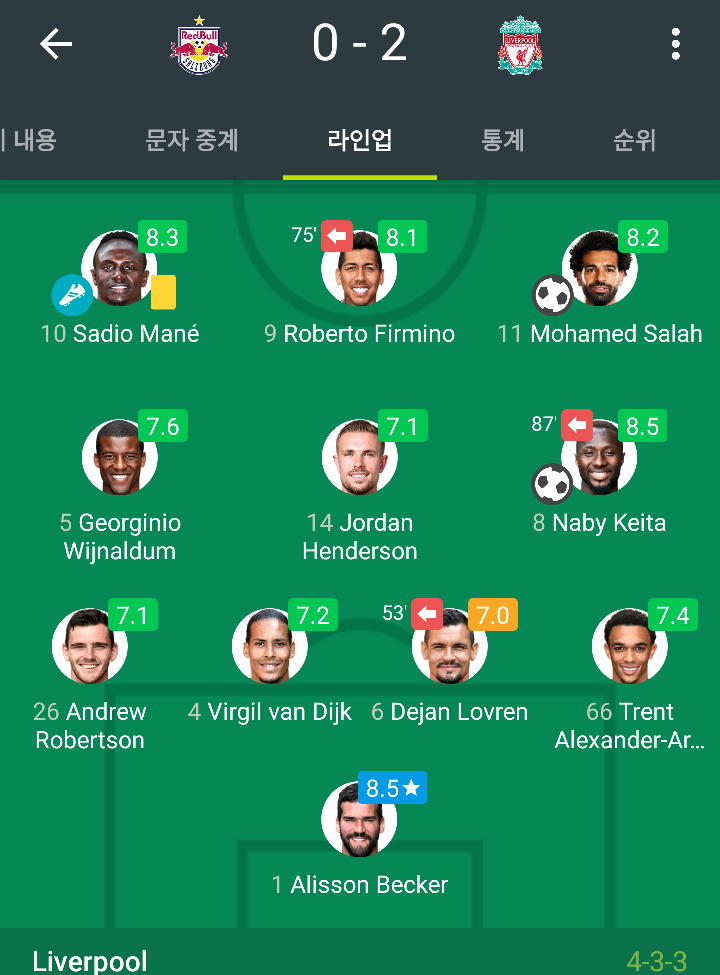 리버풀 라인업입니다. 리버풀은 파비뉴가 부상으로 베이날둠이 선발로 나오고 있고 케이타고 나오면서 중원에서 로테이션을 돌리고 있습니다. 몇 경기전에 오리에를 선발로 내 보내면서 이기면서 2군 로테이션도 좋게 성공하고 있는 리버풀입니다.