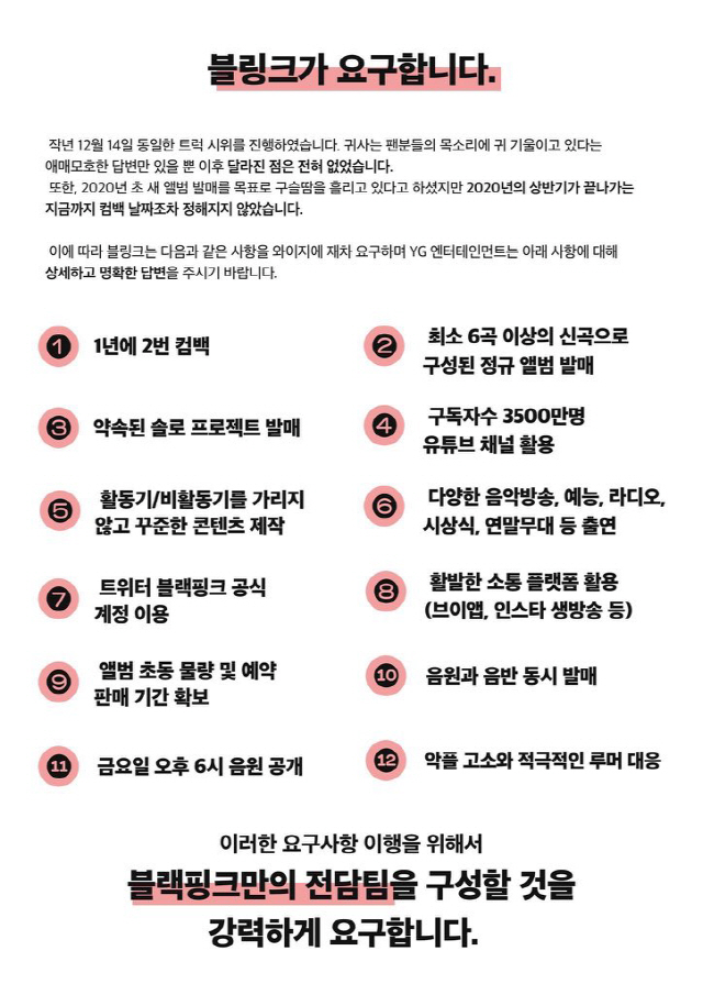 그러면서 1년 2번의 컴백, 최소 6곡 이상 신곡으로 구성된 정규 앨범 발매, 솔로 프로젝트 발매, 유튜브 채널 활용 및 콘텐츠 제작, 다양한 음악 방송 출연, 음원과 음반 동시 발매, 악플 고소와 적극적인 루머 대응 등을 요구하며 블랙핑크만의 전담팀 구성을 적극 요구한 상황입니다.