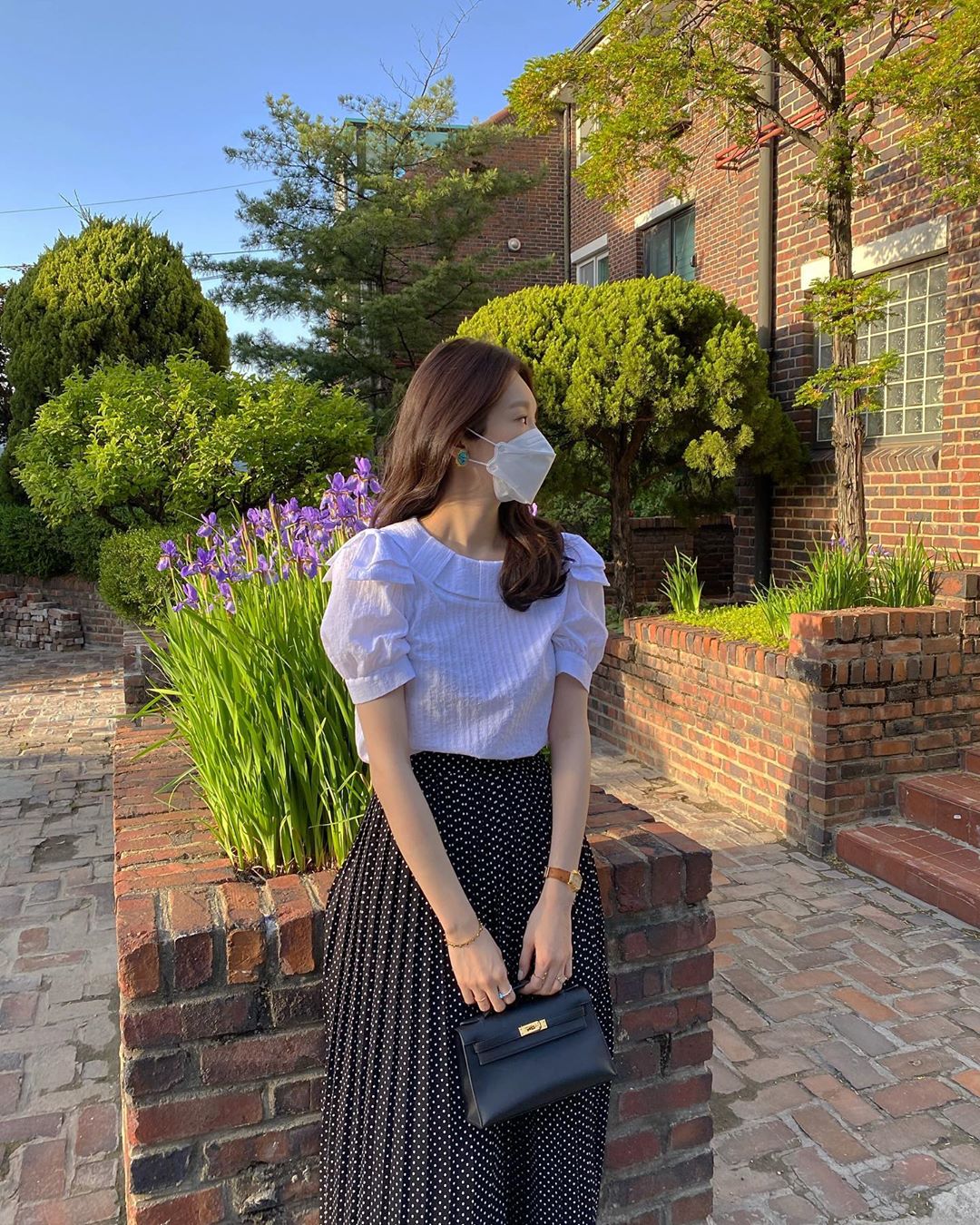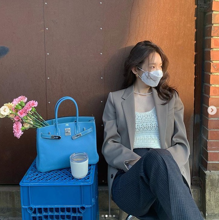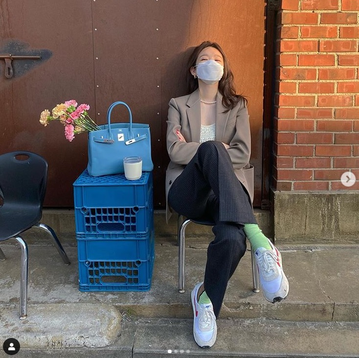 공개된 사진에는 화단에 걸터앉아 마스크를 착용하는 강민경의 모습이 담겨져 있네요!