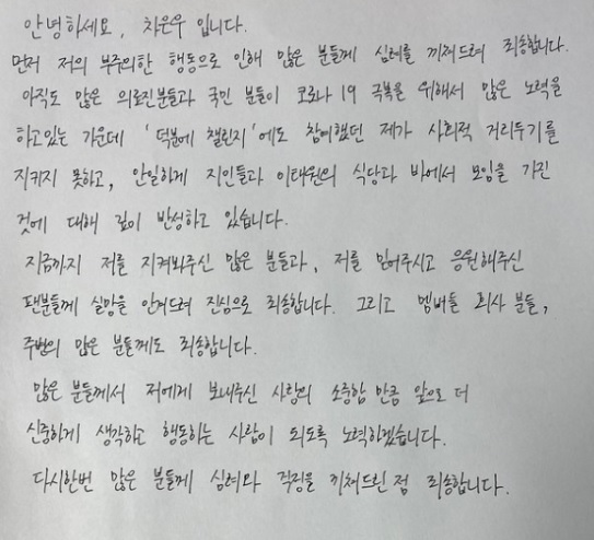 그룹 '아스트로' 멤버 차은우가 코로나19 관련 '사회적 거리두기' 기간에 이태원 음식점과 바(Bar)를 방문한 것에 대해 자필 편지를 통해 재차 사과했는데,