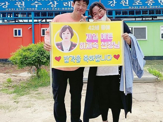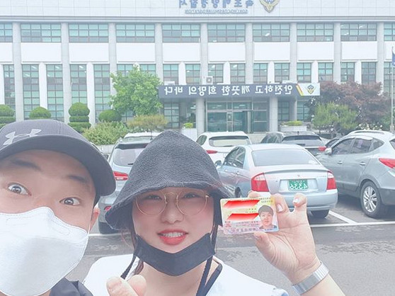 함께 공개한 배면허 인증 사진 속 하재숙은 남편과 환한 미소를 지으며 카메라를 응시하고 있네요.