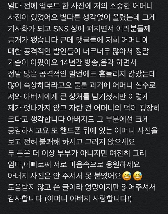 "14년간 방송, 음악 하면서 많은 공격적인 발언에도 흔들리지 않았는데 많이 속상했다. 물론 과거에 어머니 실수로 아버지에게 큰 상처를 남기셨지만 이렇게 제가 엇나가지 않고 자란 건 어머니 덕이 굉장이 크다고 생각한다. 아버지도 그 부분에선 크게 공감하신다. 핸드폰 뒤에 있는 어머니 사진을 보고 전혀 불쾌하 하고 그러지 않았다. 두 분은 더이상 부부가 아니지만 여전히 그리 엄마, 아빠로서 서로 마음속으로 응원한다. 어머니 아버지 사랑한다"라고 이야기 했습니다.