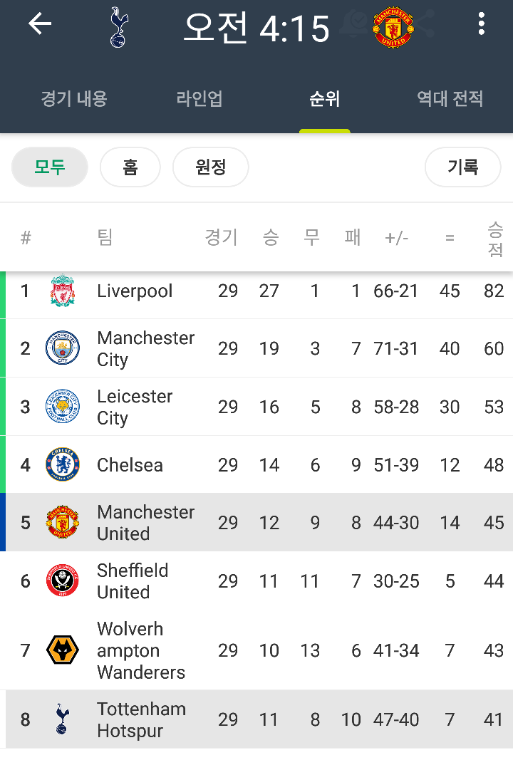 양팀의 순위입니다. 맨유는 5위 토트넘은 8위인데 양팀 승점차는 4점밖에 나지 않습니다.