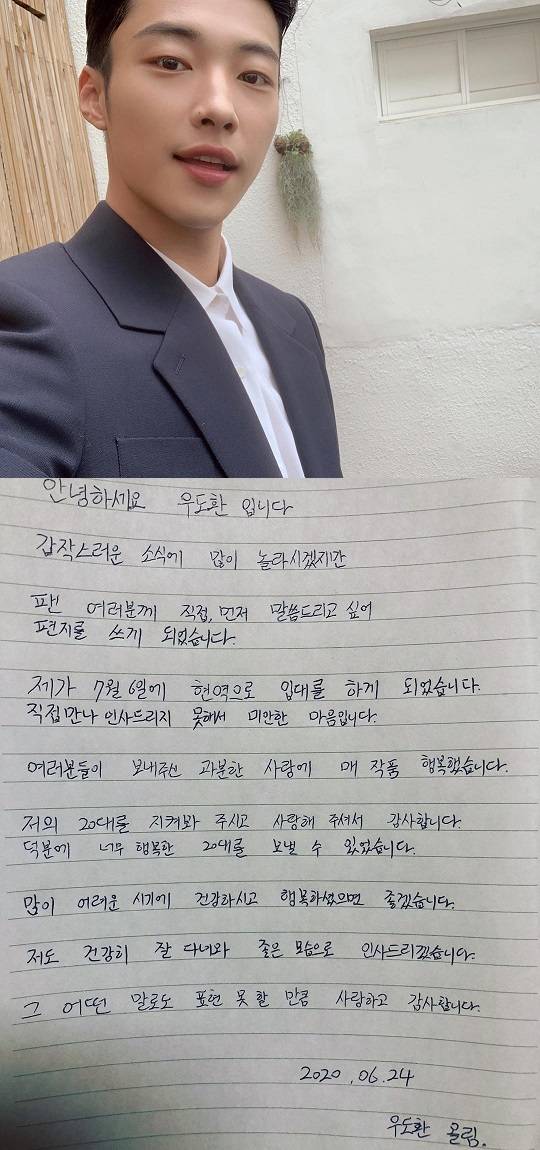 이날 우도환은 자신의 인스타그램에 자필편지를 올려 직접 입대발표를 했습니다.