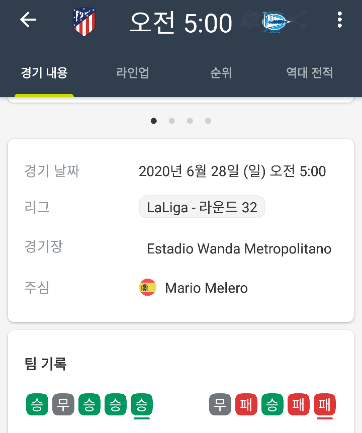 여기까지 보면 at마드리드가 유리한 것은 사실이고 최근 5경기 성적을 보면 at마드리드는 4승 1무로 3연승 중이고 데포르티보는 1승 1무 3패로 현재 2연패 중입니다.