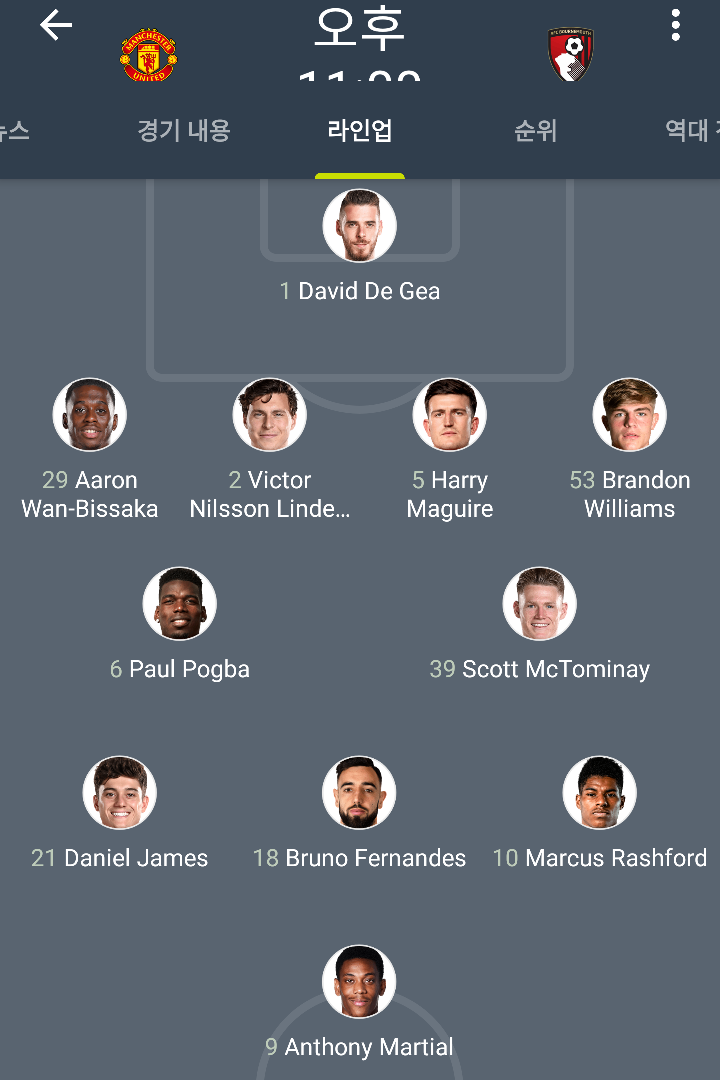 맨유의 라인업입니다. 시즌초반만하더라도 맨유는 스쿼드가 그리 좋다고 볼 수 없었는데 최근은 조합이 너무 좋은 것 같습니다.