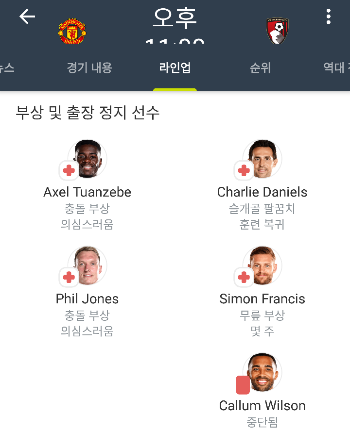 양팀의 부상자명단인데 본머스가 가뜩이나 성적도 좋지 못한데 핵심선수들 부상이 있는 상태네요!