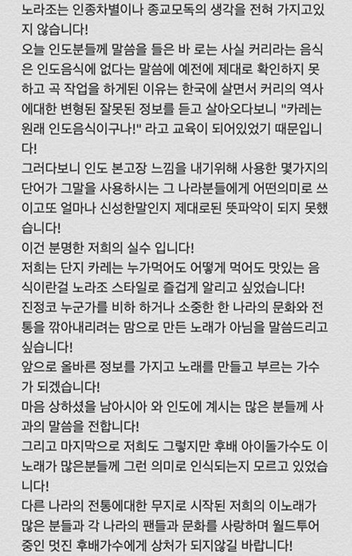 "노라조는 인종차별이나 종교 모독의 생각을 전혀 가지고 있지 않다"라며 "커리라는 음식은 인도 음식에 없다는 말에 예전에 제대로 확인하지 못하고 곡 작업을 하게 된 이유는 한국에 살면서 커리의 역사에 대한 변형된, 잘못된 정보를 듣고 살아오다 보니 '카레는 인도 음식이구나'라고 교육이 돼 있었기 때문"이라고 해명과 사과를 했습니다!