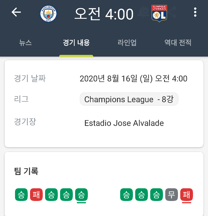 하지만 단판이라는 변수가 존재하네요! 과연 맨시티가 리옹을 잡고 4강에 갈 수 있을까요?