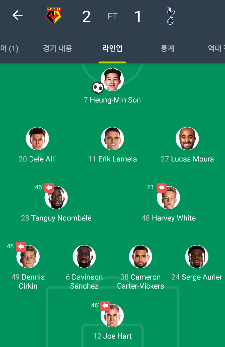 토트넘의 라인업입니다. 이번 프리시즌에서는 손흥민의 계속 선발 공격수로 나왔습니다! 해리케인은 이적설이 들려서 그런지 프리시즌에 경기를 뛰지 않았거든요!