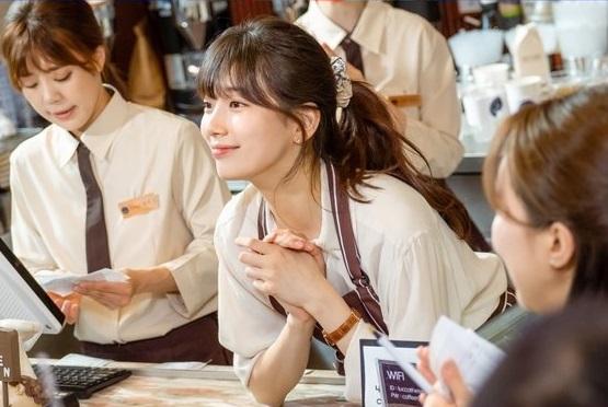 배수지는 스틸컷에서 마이크까지 차고 긴장감이 역력한 표정이지만, 그 속에선 꿋꿋한 자신감이 보이는군요! 또 다른 배수지 스틸컷에는 'CEO 서달미'는 온 데 간 데 없이 카페에서 열일 중인 '계약직 서달미'가 있는데, 어떤 계기로 스타트업에 뛰어들어 무대 위까지 오르게 될지 수지의 연기력이 엄청나게 기대되는 상황입니다!
