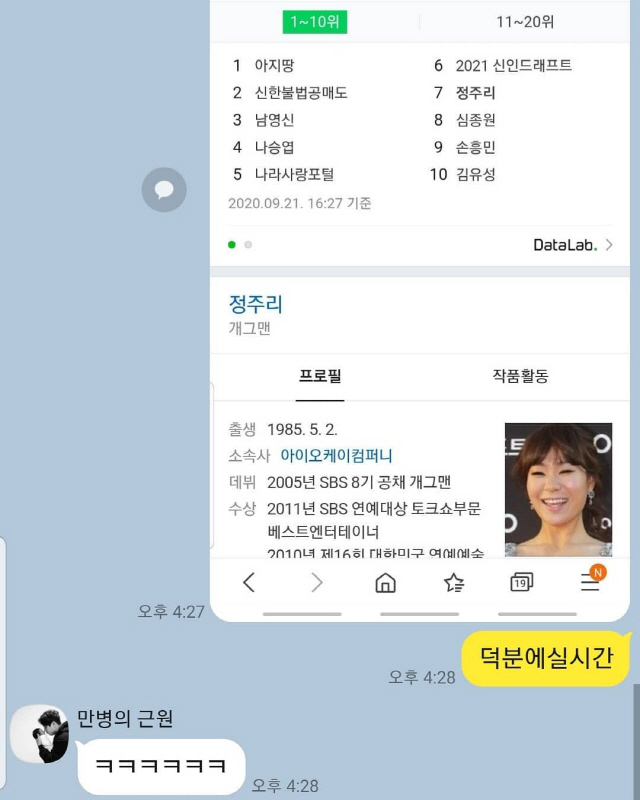실시간 검색어 순위에 오른 자신의 이름을 캡처해 남편에게 보내며 "덕분에 실시간"이라는 메시지를 남겼고, 정주리의 남편은 "ㅋㅋㅋㅋㅋㅋ"라고 답하는 모습을 보여주었네요!