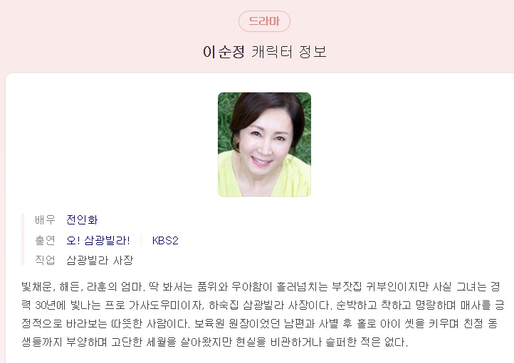 전인화는 이번 드라마에서 삼광빌라 사장 이순정 역을 연기해요! 겉으로 보기에는 품위와 우아함이 흘러넘치는 부자잣집 귀부인이지만 사실은 가사도우미 경력이 30년 이상한 인생의 산전수전을 다 겪은 역을 연기하죠!