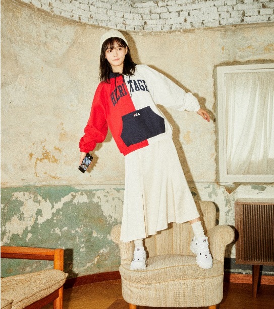 이번 화보에서 김유정은 비비드한 컬러의 후드 티셔츠에 플리스 재킷과 레더 미니스커트를 매치하였고, 스포티한 분위기의 컬러 블럭이 돋보이는 티셔츠와 여성스러운 롱 스커트를 입고 스니커즈를 매치하는 등 휠라의 가을 헤리티지 컬렉션을 완벽히 소화해 냈군요!