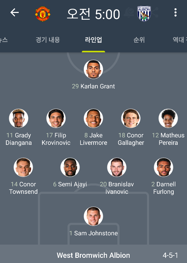 맨유는 부상자명단에 5명, 웨스트브롬은 3명이 올라가 있습니다. 맨유는 에릭 바이, 제시 린가드, 루크 쇼, 그린우드, 필 존스가 부상입니다. 웨스트브롬은 롭슨카누, 로빈슨, 샘 필드가 부상이군요! 굵직굵직한 부상은 맨유가 더 많다고 할 수 있겠습니다.