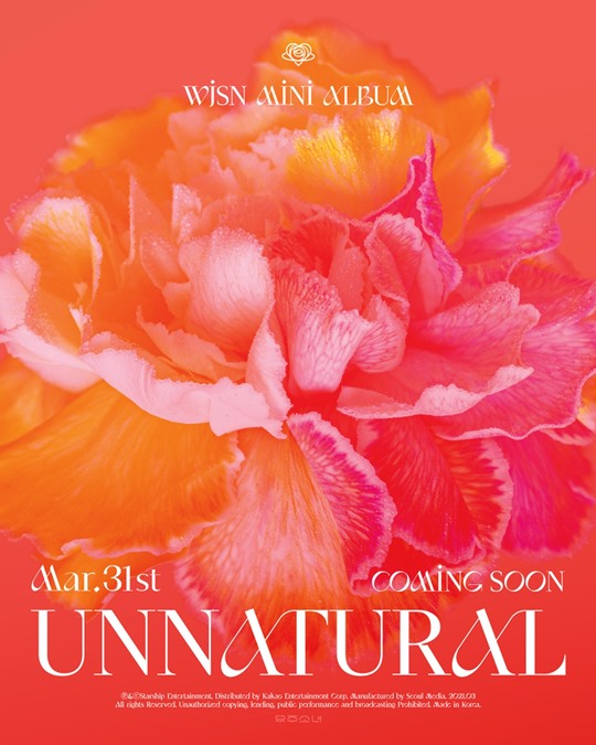 공개된 이미지에는 꽃잎이 만개한 붉은 색의 꽃 한 송이가 담겨 있는데.. 시선을 사로잡는 강렬한 꽃 한 송이가 어떤 뜻을 의미하는지 궁금증을 자극함과 동시에 'WJSN MINI ALBUM'과 'Mar. 31st', 'UNNATURAL', 'COMING SOON'이라는 문구로 앨범명과 컴백일을 밝혀 팬들의 설러게 만들고 있네요!