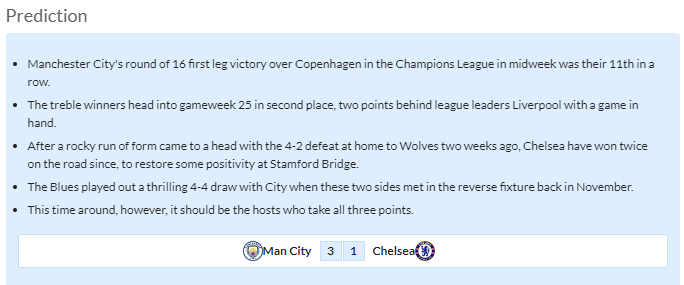 우선 후스코어드닷컴에서는 맨시티의 3-1 승리를 예상한 상태입니다.