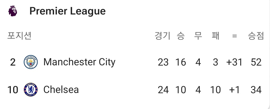 첼시는 10승 4무 10패 41골 40실점으로 리그 10위 팀입니다.