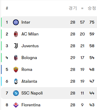 현재 인터밀란이 승점 75점으로 리그 1위, 그리고 나폴리는 승점 44점으로