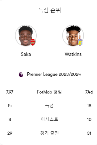 그리고 양팀의 최다 득접ㅁ자를 보면 아스날은 사카가 14골 8도움을 기록하고 있고