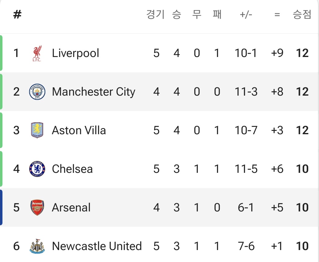 맨시티 아스날 의 순위는 현재 5라운드가 거의 진행된 가운데