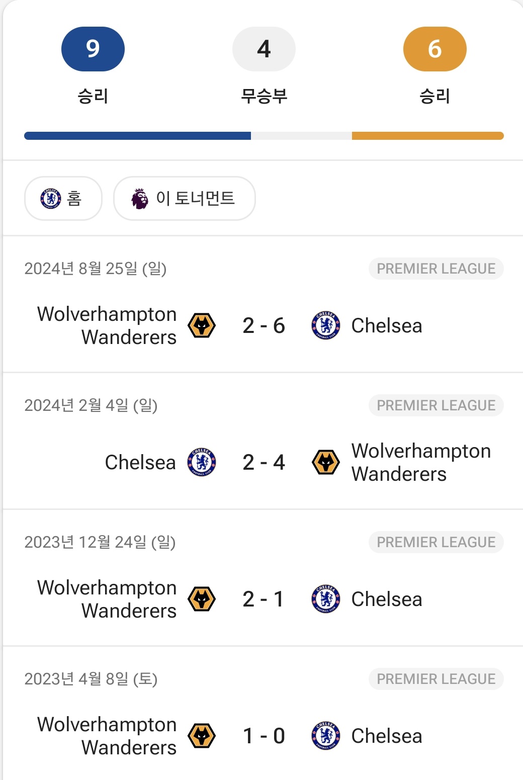 첼시와 울버햄튼은 총 21번 맞붙었으며, 첼시가 11승, 울버햄튼이 6승, 무승부는 4회 기록되었습니다.