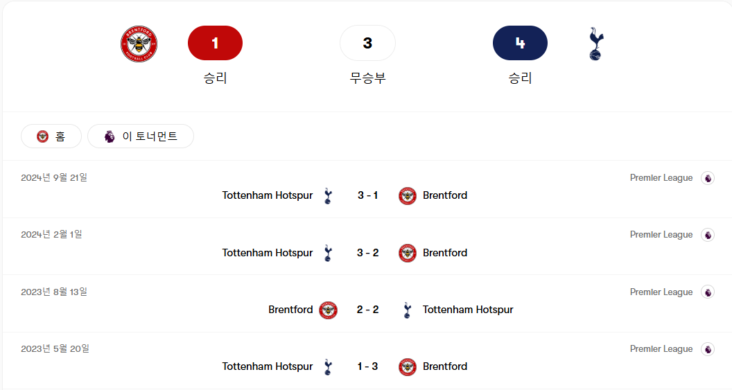 브렌트포드와 토트넘은 총 8번 맞대결을 펼쳤습니다. 이 중 브렌트포드가 1승, 토트넘이 4승을 거두었으며, 3경기는 무승부로 끝났습니다. 토트넘이 상대 전적에서 우위를 보이고 있습니다.