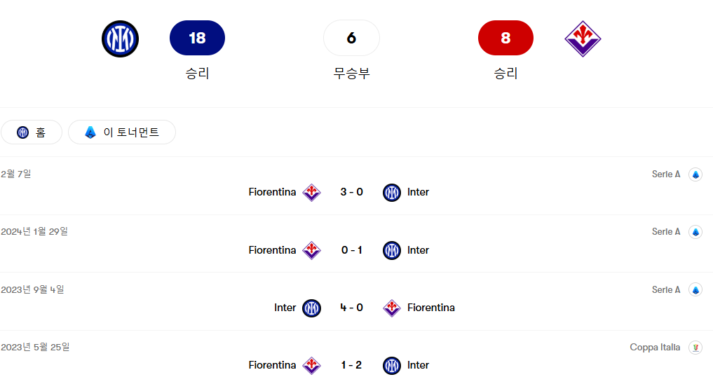 두 팀은 총 38번 맞붙었으며, 그 중 인터 밀란이 22승, 피오렌티나가 8승, 그리고 8번의 무승부를 기록하였습니다.