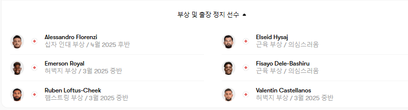 양 팀 모두 부상자가 존재합니다. AC 밀란은 카일 워커, 알레산드로 플로렌치, 루벤 로프터스-치크 등이 결장할 예정이며, 라치오는 알레산드로 로마뇰리의 출전 여부가 불투명합니다.