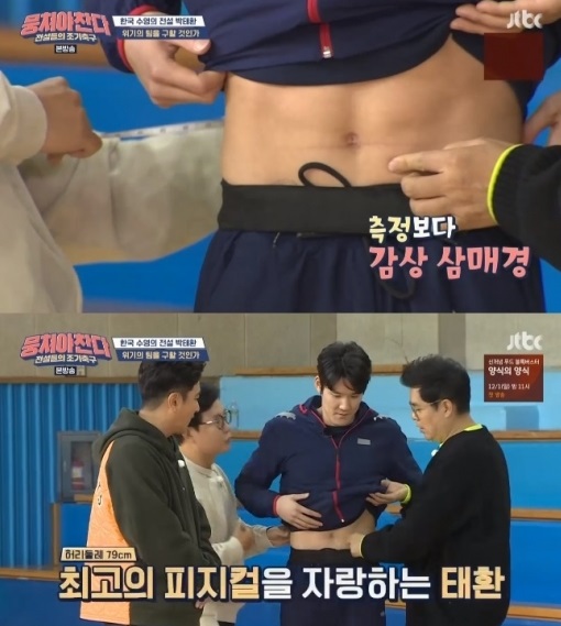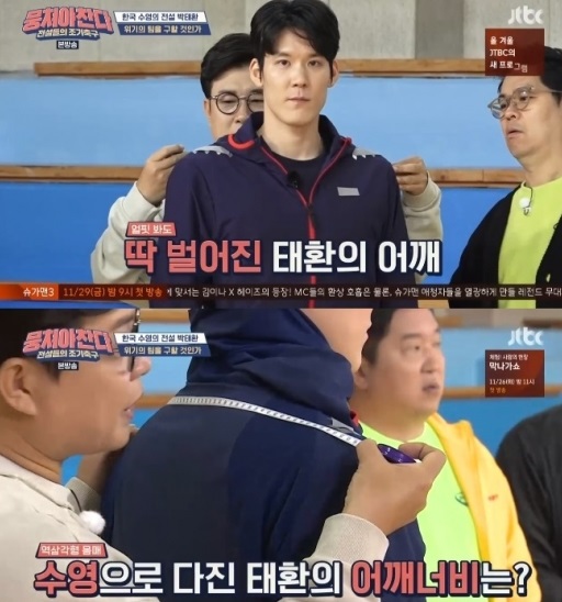 무엇보다 박태환의 어마어마한 피지컬에 '어쩌다 FC' 멤버들의 관심이 모아졌네요!!. 이에 자타공인 어깨 깡패로 불리는 박태환의 어깨너비가 공개되었는데 대한민국 남자 평균이 43cm인데, 이날 공개된 박태환의 어깨너비는 무려 54cm인 박태환이네요!