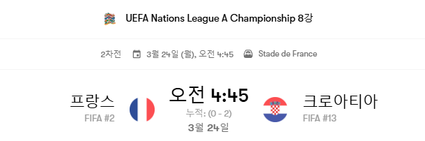 크로아티아와 프랑스는 2025년 3월 21일 열린 UEFA 네이션스리그 8강 1차전에서 크로아티아가 2-0으로 승리하며 앞서나갔습니다. 이제 양 팀은 3월 24일 프랑스에서 2차전을 치르게 됩니다.