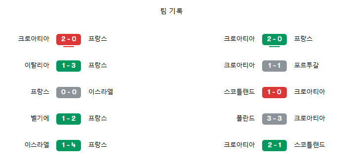 프랑스와 크로아티아는 1998년 이후 총 5번의 A매치에서 맞붙었으며, 프랑스가 3승 2무로 우위를 점하고 있습니다. 특히 1998년 프랑스 월드컵 4강전에서 프랑스는 크로아티아를 2-1로 꺾고 결승에 진출한 바 있습니다.